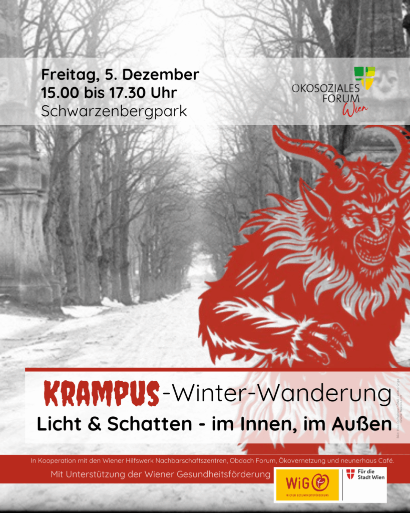 Im winterlichen Wald erleben wir die Dämmerung gemeinsam. Der Krampus steht bei unserer Wanderung für das Schattenhafte und Unerwünschte. Aber wo Licht ist, ist immer auch Schatten. Was brauchen wir, um Licht in uns hineinzulassen? Und was brauchen wir, um uns mit dem “Krampus in uns” zu versöhnen?