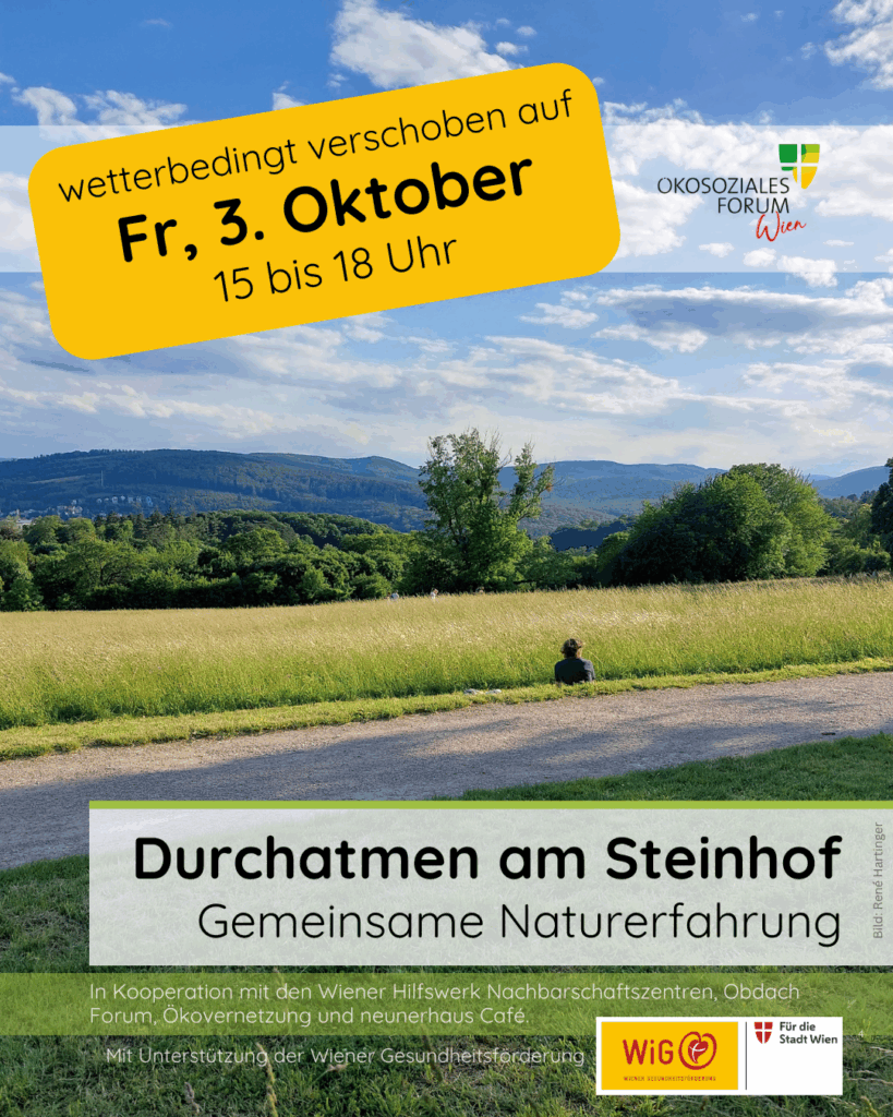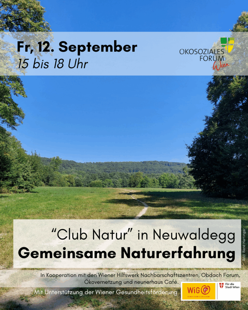 Daher lädt das Ökosoziale Forum Wien unter dem Motto „Club Natur“ zu kostenlosen Naturerfahrungen ein. Es handelt sich um kleine Wanderungen, in die einfache Übungen zur Achtsamkeit, Stressabbau und Selbstreflexion eingebaut werden. Club Natur Workshops sind Zeit für sich selbst, in der Gruppe erlebt, um Stress loszulassen, wieder bei sich selbst anzukommen und Zeit mit anderen interessanten Menschen zu verbringen.